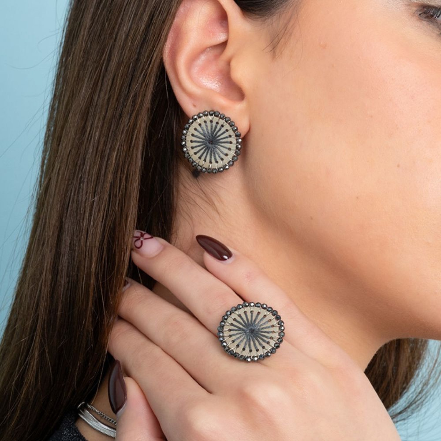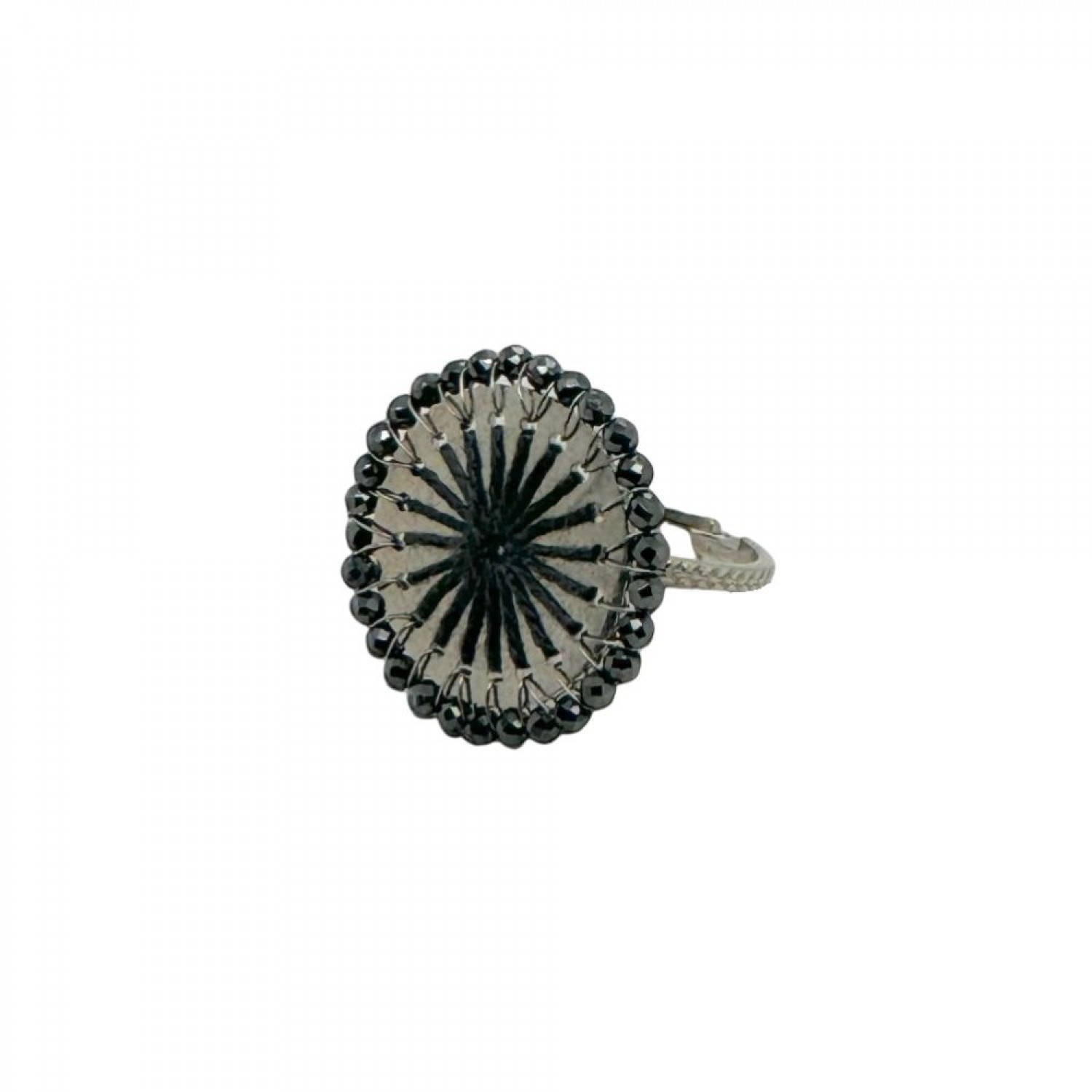 Κατασκευασμένο από επιροδιωμένο ορείχαλκο, σε σχήμα ροζέτας, είναι κεντημένο με γκρι κλωστή και διακοσμείται με γκρι πέτρες.